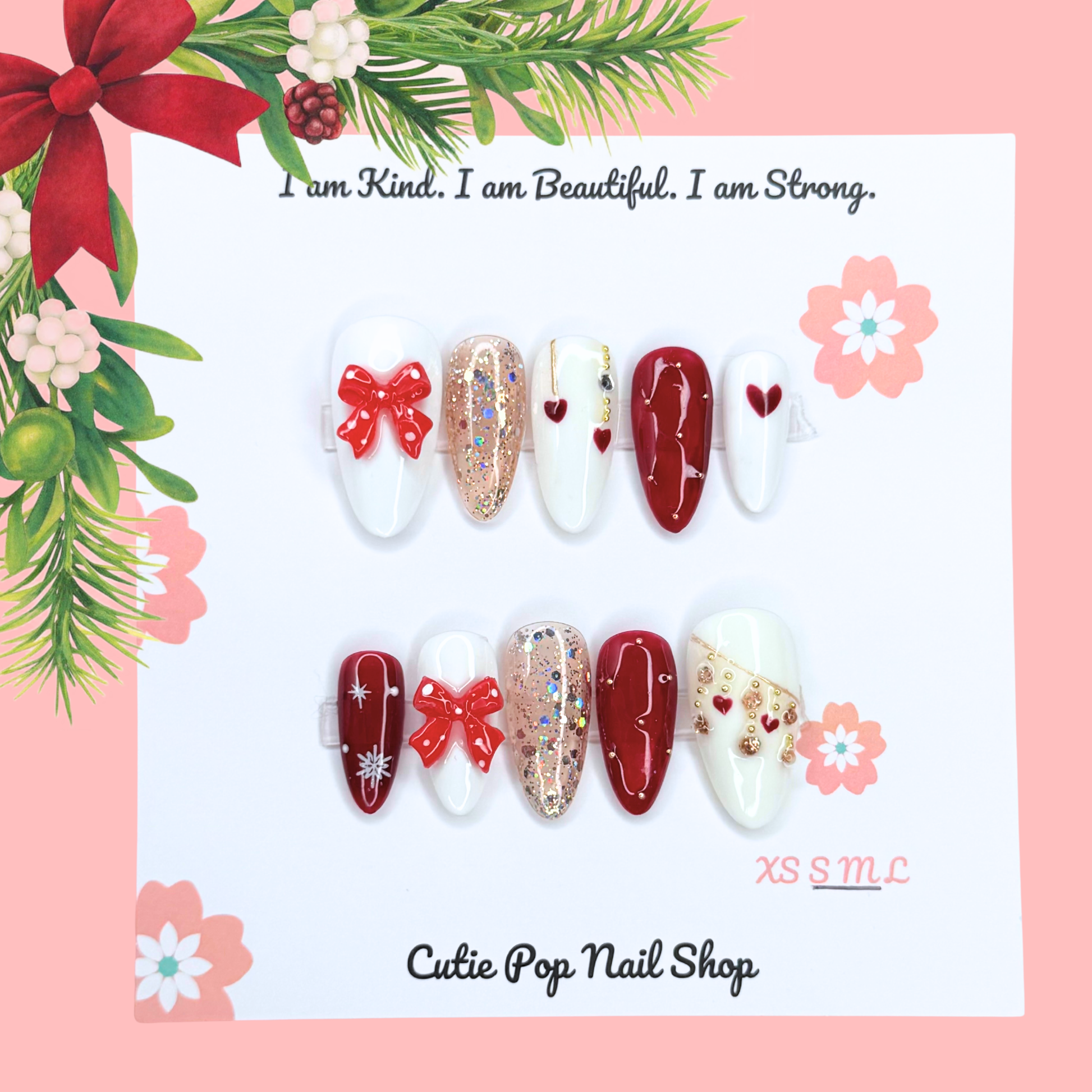 These Christmas Bow press on nails feature a 3D red bows with polka dot detailing. Rich burgundy tones, shimmering rose gold glitter and heart accents create a romantic holiday look that's equally perfect for Christmas celebrations or Valentine's Day gatherings!