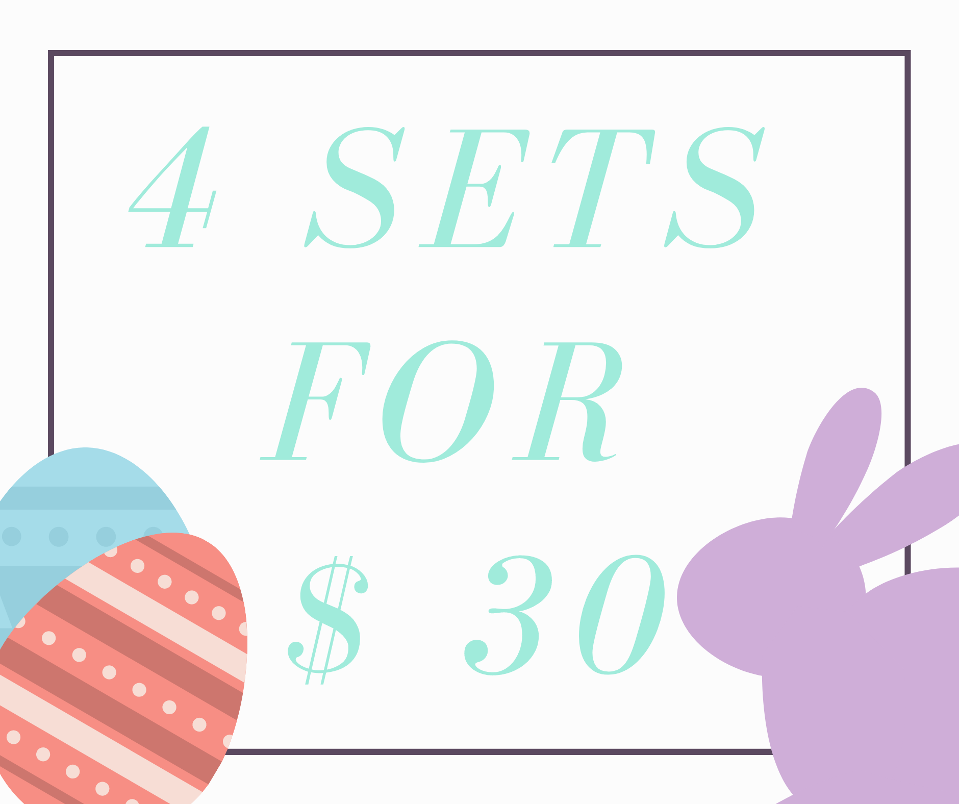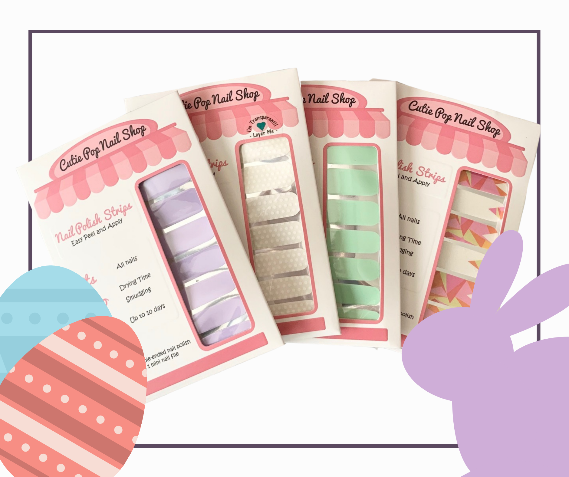 This Easter bundle can be worn so many ways! It includes solid colors, designs and a fun transparent nail strip! Layer the transparent white dots over the solids to get a fun Easter themed polka-dot look!