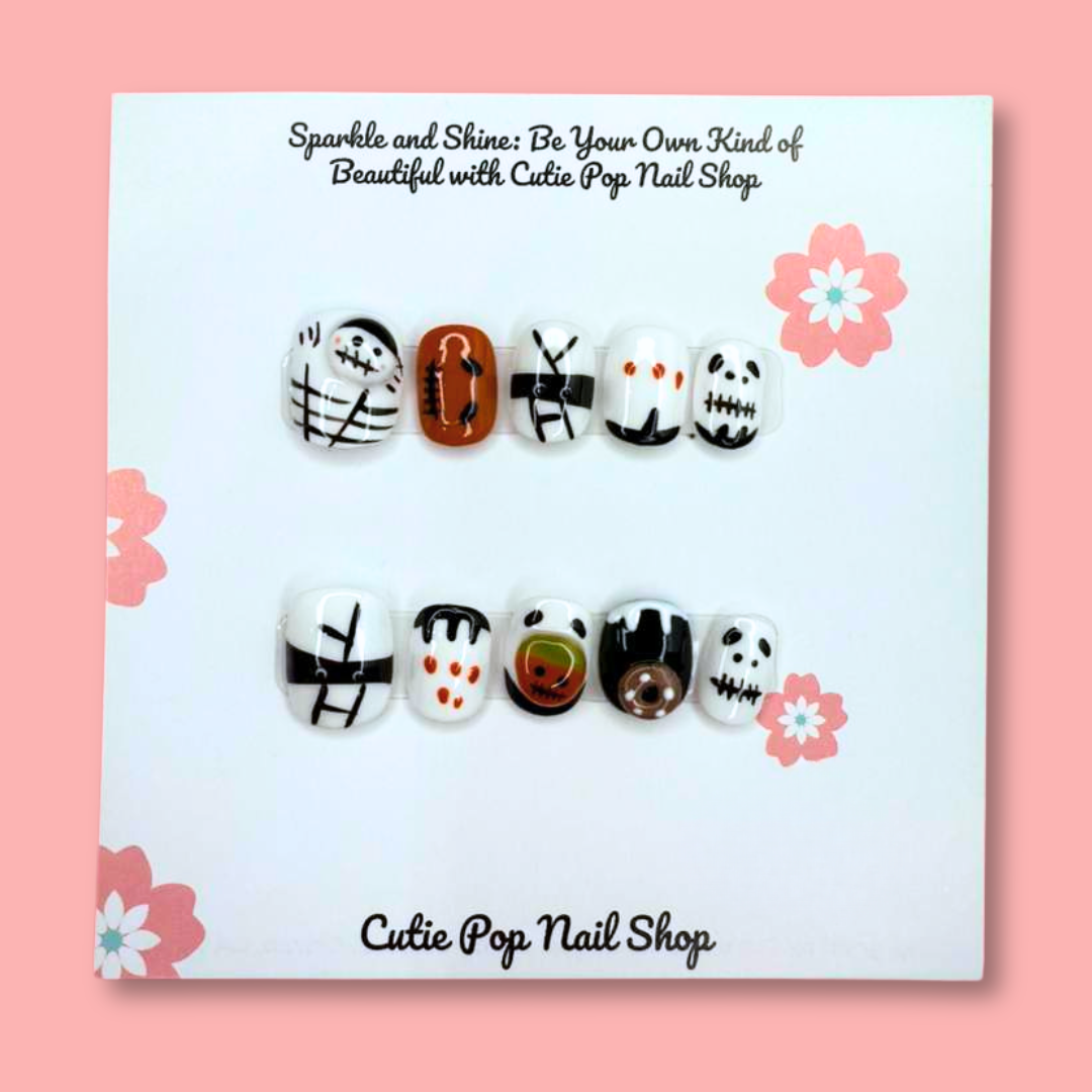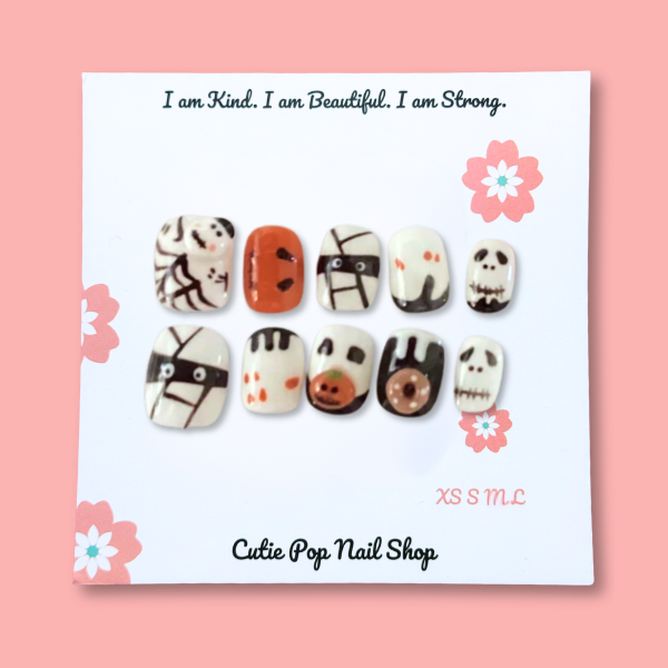 Get wrapped up in spooky fun with the Halloween Mummy Press-On Nails! This playful set features hand-painted mummy designs, skulls, spiders, and pumpkins on a mix of white, orange, and black bases. With cute yet creepy details, these nails are perfect for adding Halloween spirit to your look. Easy to apply, reusable, and designed for comfort, they’re a must-have for anyone who loves festive, themed nail art!