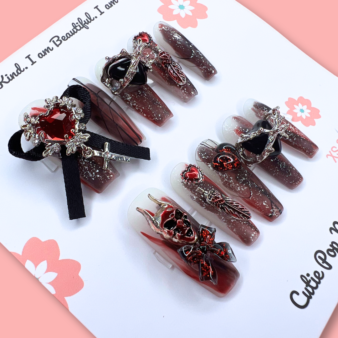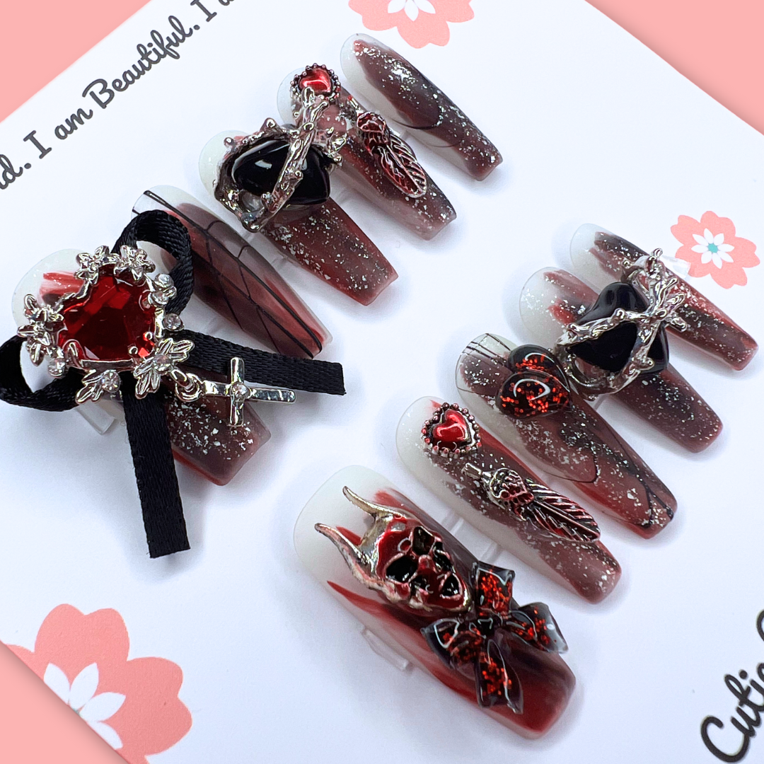 Unleash your dark side with the Red Demon Press-On Nails! Featuring deep blood-red tones, gothic silver charms, black gemstone accents, and striking 3D details, these nails are designed for those who love bold and dramatic style. Each set combines glitter gradients with unique charms like crosses, wings, and demonic motifs—perfect for a gothic, Halloween, or alternative fashion look. Durable and reusable, these press-ons make a fierce statement for any occasion.