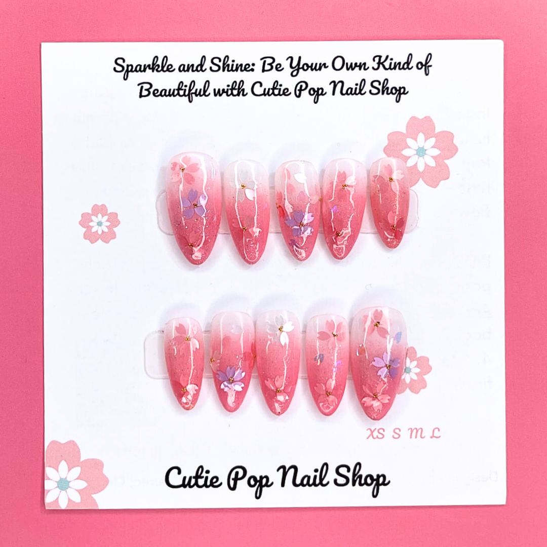 Sakura Pink and white ombre press-on nails featuring beautiful cherry blossom flower and petal accents for a delicate and elegant style.