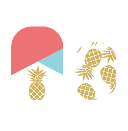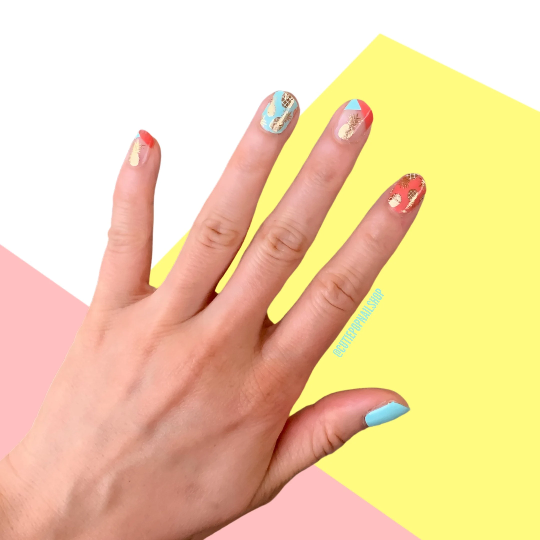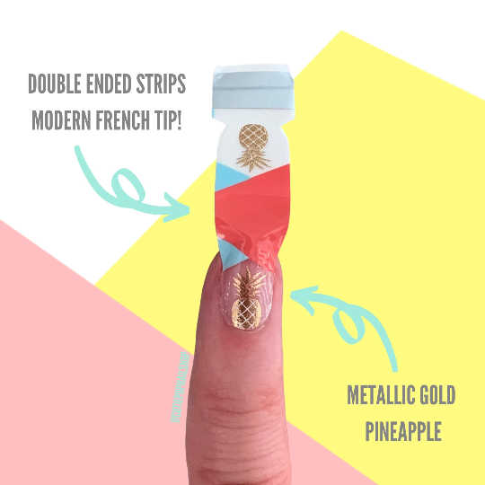 Summer of Pineapple has a transparent base, metallic gold pineapples, coral and aqua. Perfect for summer! Wear it over a colored base to create new looks.