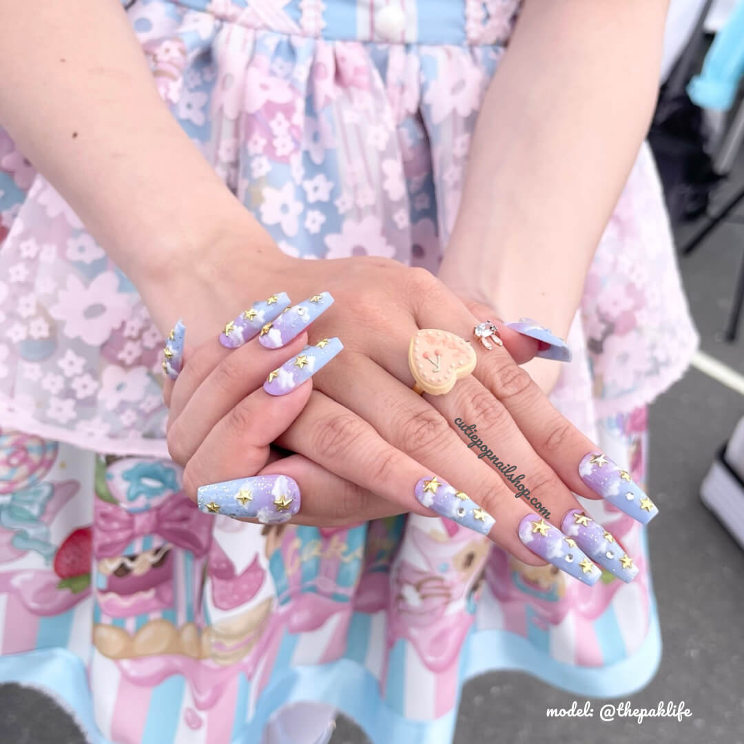 Purple and blue ombre with gold stars and white clouds. This set comes in almond or coffin shape in a medium length.