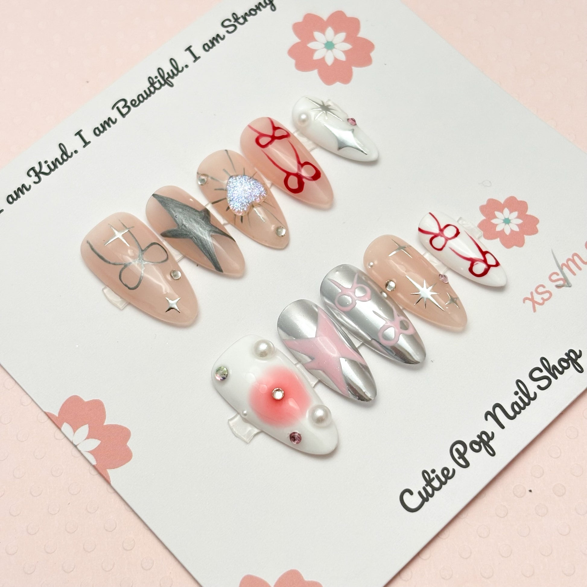 Y2k White Silver Star Bow Press-on Nails - Short Length Almond